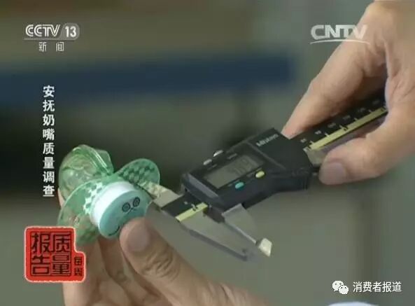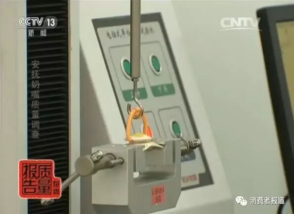 其中一款安抚奶嘴仅在1.5牛的拉力下,就从测试器中脱落了。而1.5牛的拉力相当于提起150多克重物所需要的力气。如果宝宝遇到这样的安抚奶嘴,在日常使用过程中,容易吸入口腔,引起窒息。