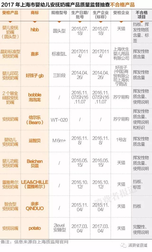 7月3日,上海市质量技术监督局最新发布了对婴幼儿安抚奶嘴产品质量专项监督抽查的结果。本次抽查的20个批次婴幼儿安抚奶嘴中,七成来自天猫、一号店、苏宁易购、飞牛网等电商平台,三成来自生产和流通领域。