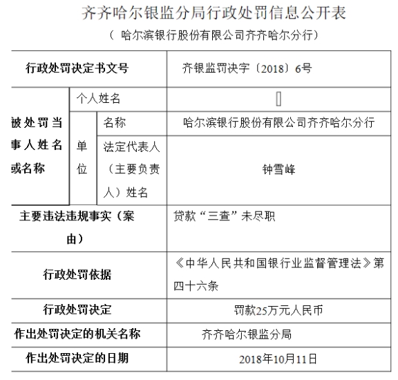 10月26日:哈尔滨银行齐齐哈尔分行因贷款“三查”未尽职 被罚25万元
