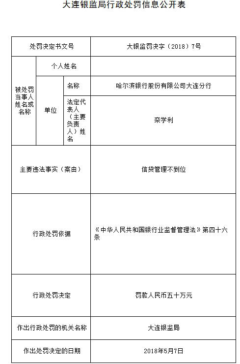 5月14日,银保监会网站公布对哈尔滨银行股份有限公司大连分行的行政处罚决定。哈尔滨银行大连分行信贷管理不到位,被大连银监局罚款五十万元。行政处罚的依据是《中华人民共和国银行业监督管理法》第四十六条。