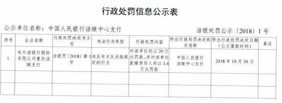 11月15日,中国人民银行涪陵中心支行网站发布的行政处罚信息公开表(涪银处罚〔2018〕第1号)显示,哈尔滨银行股份有限公司重庆涪陵支行违反有关反洗钱规定的行为,被中国人民银行涪陵中心支行处以20万元罚款,并对该单位直接责任人处以1.4万元罚款。