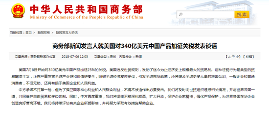 商务部新闻发言人就美国对340亿美元中国产品加征关税发表谈话