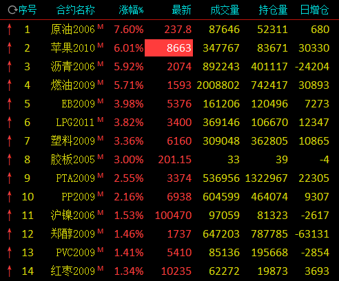 苹果主力2010合约早间中幅高开,随后在多头资金的进一步“怂恿”下,该合约涨幅突破5%,期价升至8600点关口上方,一度站上两周高位。