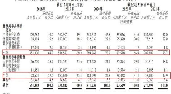 医疗美容手术服务营收占比则在逐年减小,2018-2020年分别占比27%、25.4%、22.8%、今年一季度进一步缩小至19.9%。