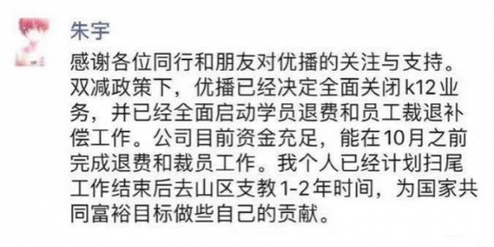 新东方在线副总裁、东方优播CEO朱宇发布朋友圈称,新东方在线已决定全面关闭旗下K12业务东方优播,并已全面启动学员退费和员工裁退补偿工作。公司目前资金充裕,预计将在10月之前完成退费和裁员工作。而朱宇本人则计划前往山区支教,为共同富裕做贡献。