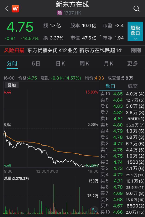 消息传出后,新东方在线的股价盘中不断下挫,最终收于4.75港元,下跌14.57%。新东方(9901.HK)也下跌7.915,收于16.06港元。
