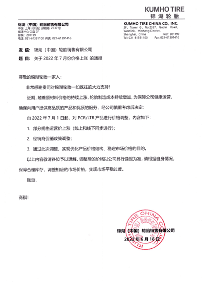 早些时候,普利司通就曾在《2022年7月涨价通报》中表示:“一直以来因生产轮胎所需的各项原材料价格持续走高,物流成本居高不下,导致轮胎的生产流通成本急剧上升……经我司慎重研究决定,自2022年7月1日起所有商品将上调价格3-5%以上。”