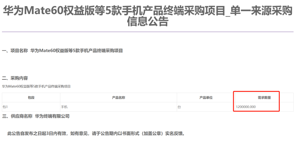 值得一提的是,中国移动采购与招标网此前也公示过采购华为相关系列手机,不过台数超过百万数量仍然比较少见,此次120万台属于比较大的订单,按照华为Mate 60 (12GB+256GB)起售价5499元/台计算,120万台华为Mate 60系列手机货值也达到约66亿元。